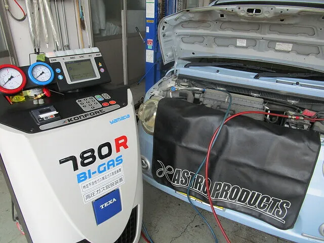 作業には、最新のカーエアコン用冷媒充填装置「KONFORT 780R BI-GAS(TEXA製)」を使用。
