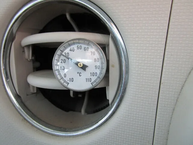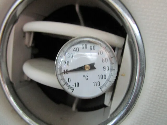 エアコンを“LO”に設定しても、吹き出し口の温度を計測すると約28℃と、ほとんど冷えていない状態でした。